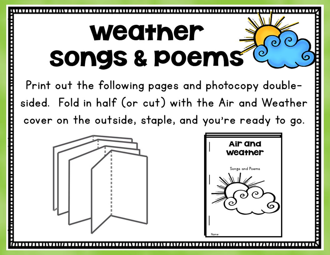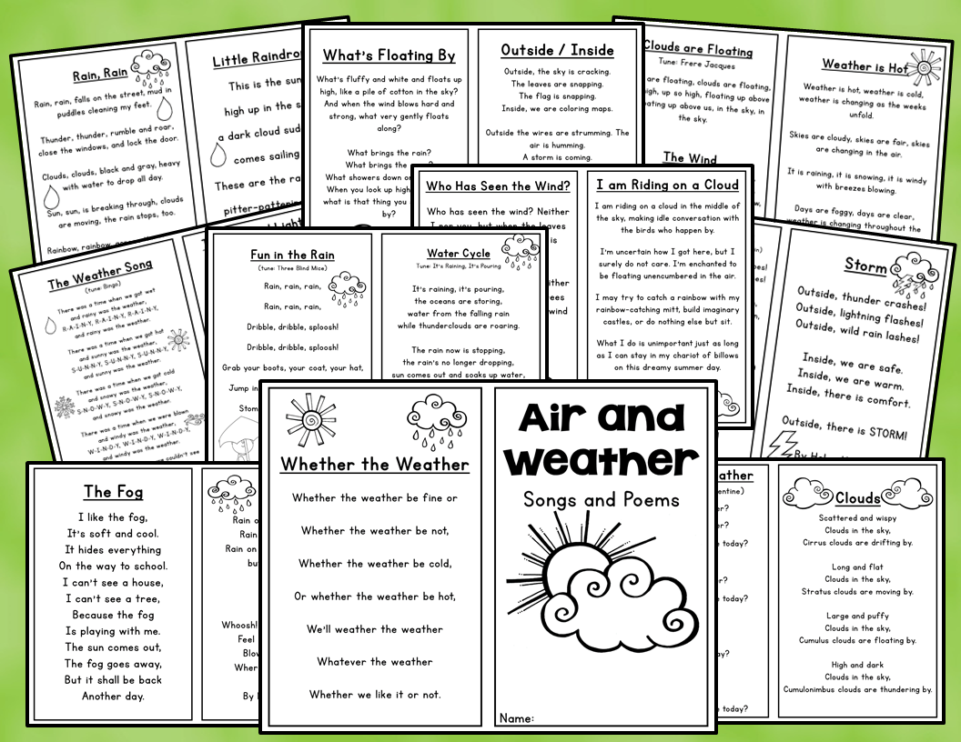 Welcome to Day 3 of the Air & Weather freebies! I’m so glad you are back for more. In case you are just joining in on the fun, you can read about Cloud Activities here and find Games & Art Ideas here. Today’s focus is all about air and weather songs and poems.