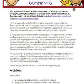 Our school is on a trimester system, so I write report cards three times a year. When I first started teaching I wrote them all by hand. I had to painstakingly plan out what I would write first so I wouldn't have to second guess and use gobs of white out. I am thankful for the computerized version, even when I have to edit and revise to make sure I don't exceed the character limit. One of the first things I was ever told was to start and end with a positive. For some students this is a piece of cake. For others this can provide ... read more
