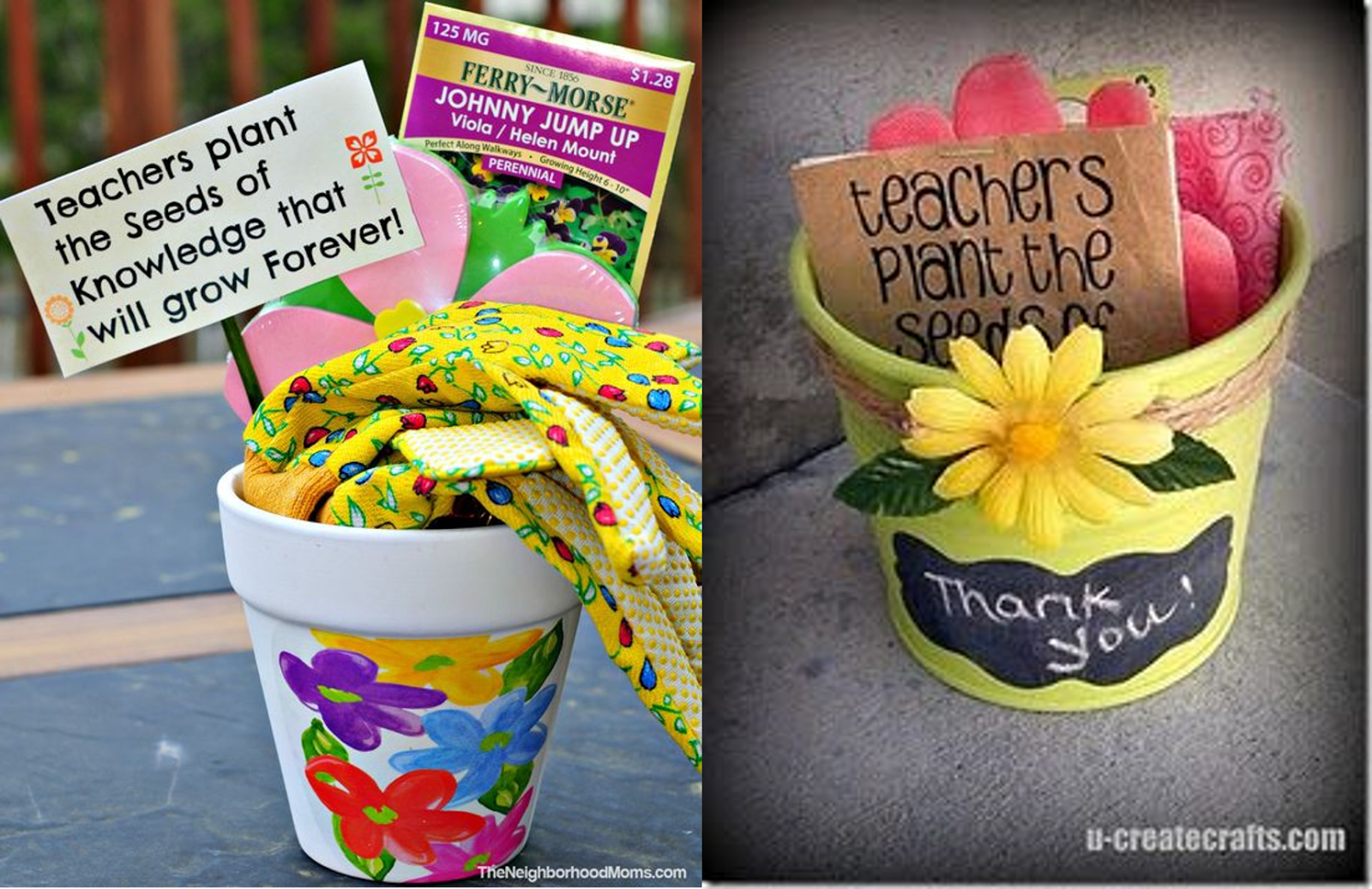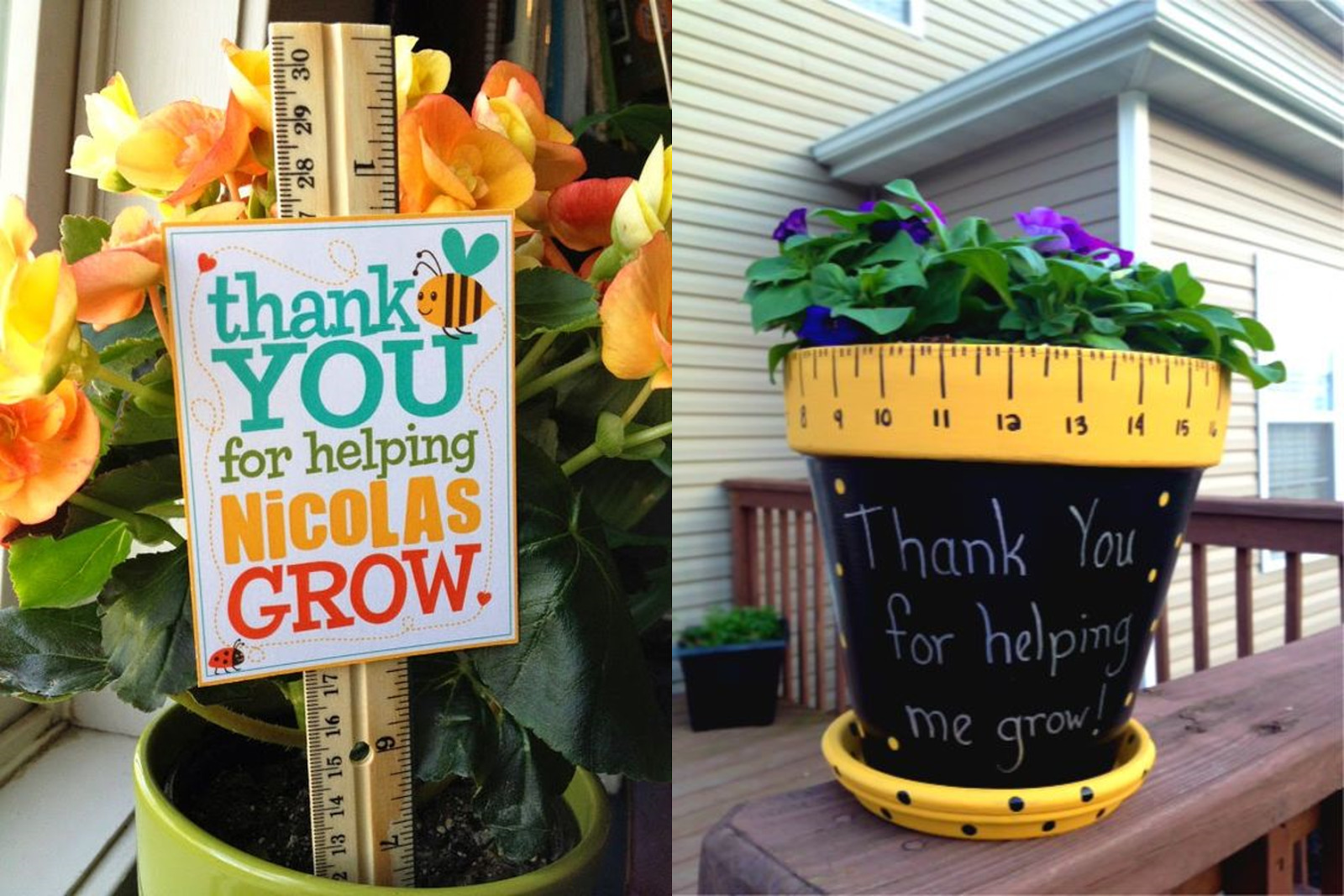 If your teacher loves flowers and gardening, then a gift that grows is a great choice.  I love the personal touches on these two planters: