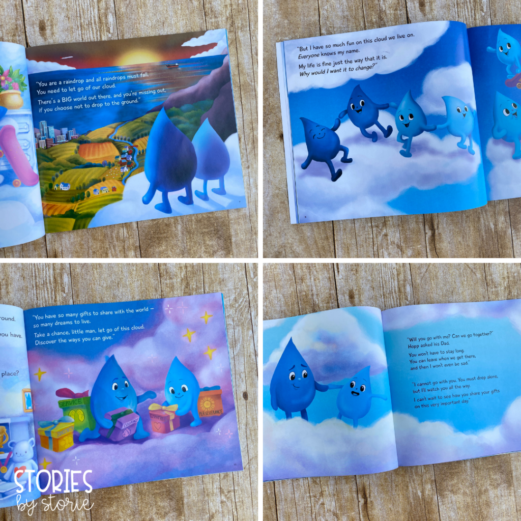 • Big Feelings: In this story, Hopp the raindrop is scared of change. Students will look at raindrop faces to determine how each one feels and share about a time they felt that way.