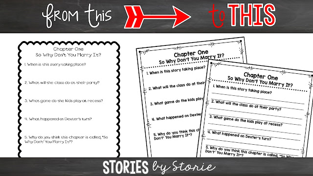 The next thing I changed was the borders and fonts, I added an option for lines on the comprehension question pages, and I made sure each chapter had it’s own dedicated page. This left some blank spaces at the bottom of several pages, but it leaves a great opportunity to have students stop and draw a visualization, tackle vocabulary in context, or even to write (predictions, summaries, open-ended questions, etc.):