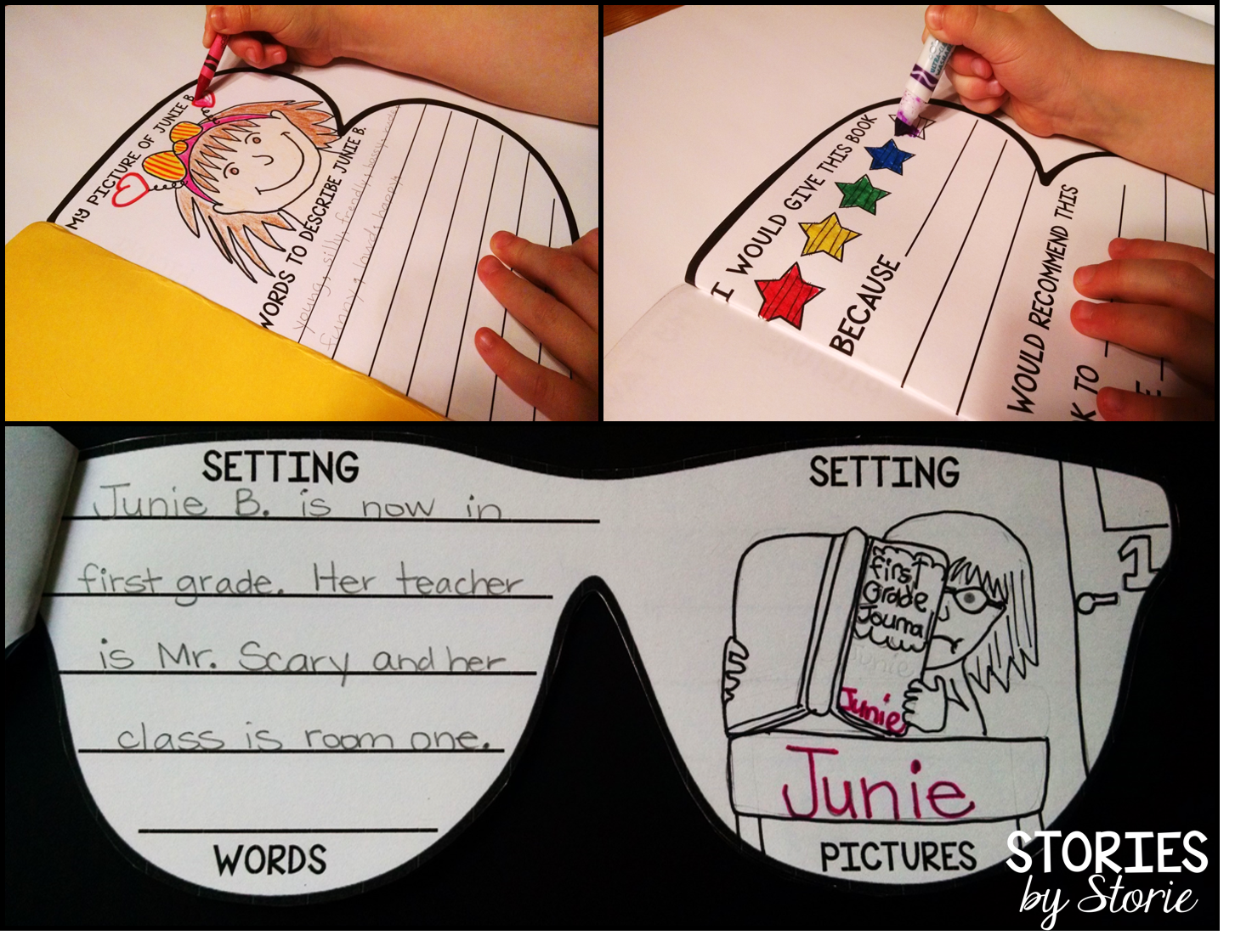 Do you remember when Junie B. learned she needed glasses in Junie B. Jones First Grader at Last? Since the glasses become an important part of Junie B.’s appearance, I thought it would be fun to include a glasses template, too! You can print the templates onto colored paper or let the students decorate them. You can also choose to turn them into sunglasses by adding black lenses.