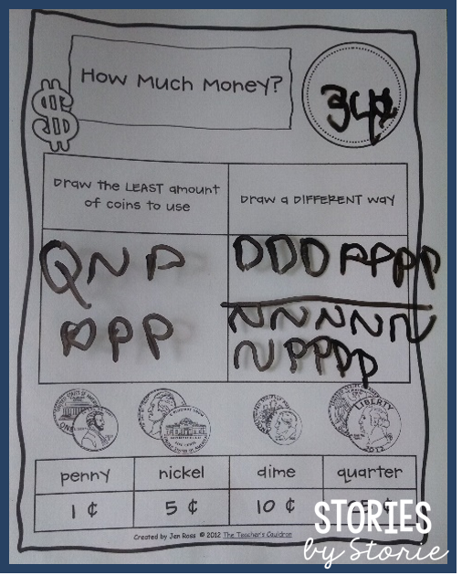 Second graders can always boost their money skills, right? I love that this page forces students to use the fewest coins possible. Even though the box on the right asks for one different way, I have my students draw a line (sometimes two lines) to show multiple different ways. It really shows me who is struggling with coin combinations and values. Oh, and once we get further into the school year, I’ll let my students use half dollars (HD) to save space.