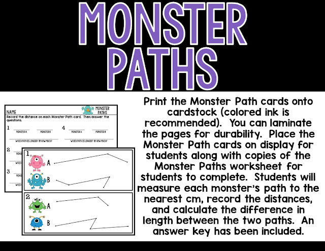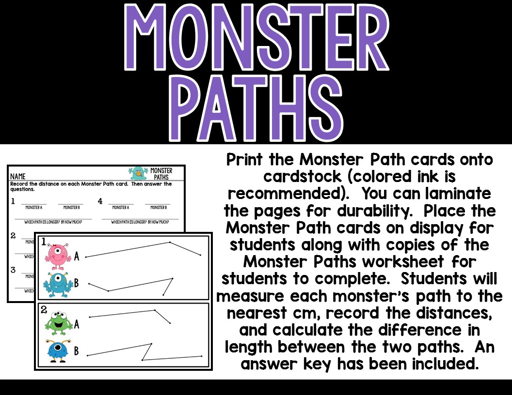 There are 6 cards included, with 2 monster paths on each card. Students must first measure and record the length of each monster’s path. Then students compare to determine which path is longer. Finally, students must calculate the difference between the two paths.