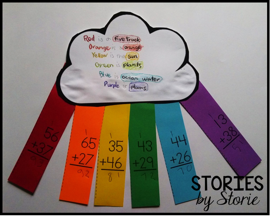 I figured we could do double duty and add our rainbow poems to the cloud. You can see that some of my kids worked on the 2-digit problems included with the craft and others had 3-digit problems I added for them.You can get your own copy of this rainbow craft here.