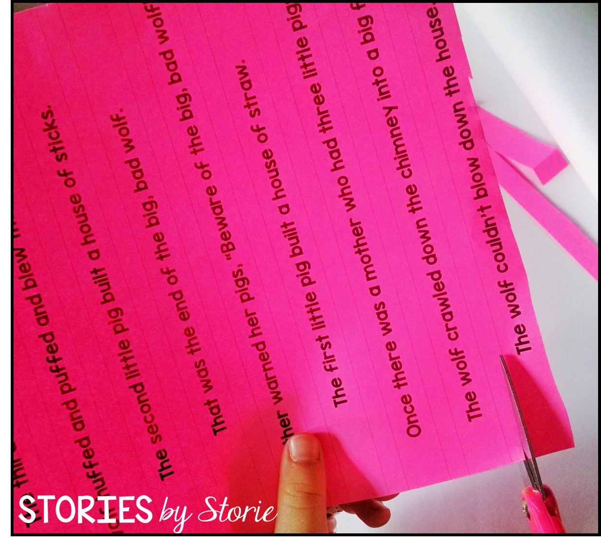 The teacher took the role of the Big, Bad Wolf and blew on the story of The Three Little Pigs until all of the events of the story were out of order. Each student received a copy of the mixed-up tale: