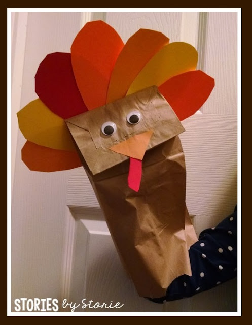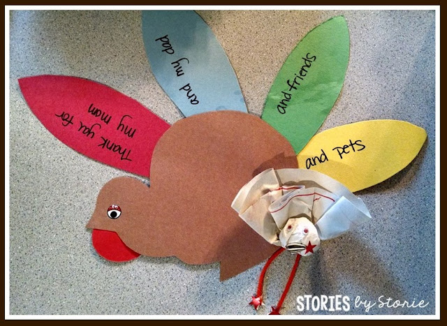 The third project was a Turkey Puppet(inspired by this pin).  We needed a paper bag, googly eyes, construction paper, scissors, glue, and a stapler (to hold those turkey feathers together before we glued).