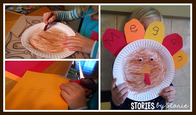 The second project was a Name Turkey(inspired by this pin).  We needed a paper plate, brown crayon, googly eyes, construction paper, scissors, and glue.