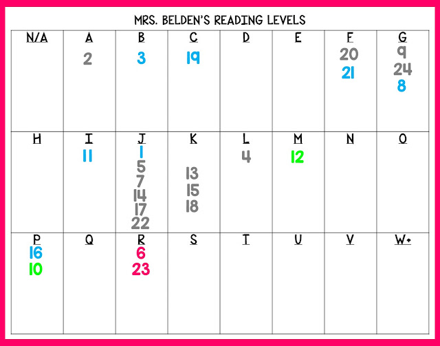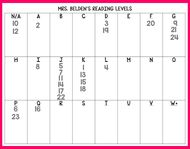 After receiving my class list, I plug in the names of students onto the chart. This one page chart is super handy while making sure to prep enough copies for reading assessments. Not to mention it fits into a sheet protector that is kept in the front of my grade book for safe keeping! Here is an example of a class I recently had. I use names on my handwritten chart, but changed them to numbers to protect student privacy while sharing here.