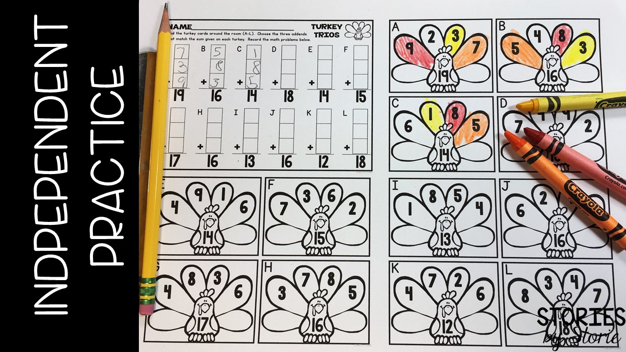 However, my 2nd grade students still saw 3-addends in their daily work when using our curriculum materials. We focused on strategies for solving (look for tens partners, doubles, number neighbors, etc.). Most of my students were able to tackle these problems, but some still needed more practice so I put together these Turkey Trios.