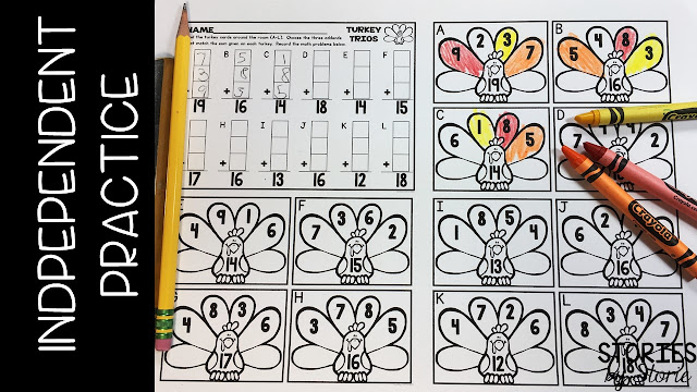 I have also used these cards for independent practice. When printing, I select to print 4 per page. This way the students have all of the cards and the recording sheet in one place while they work. I had students color in the turkey feathers used and then record the numbers on the recording sheet form.