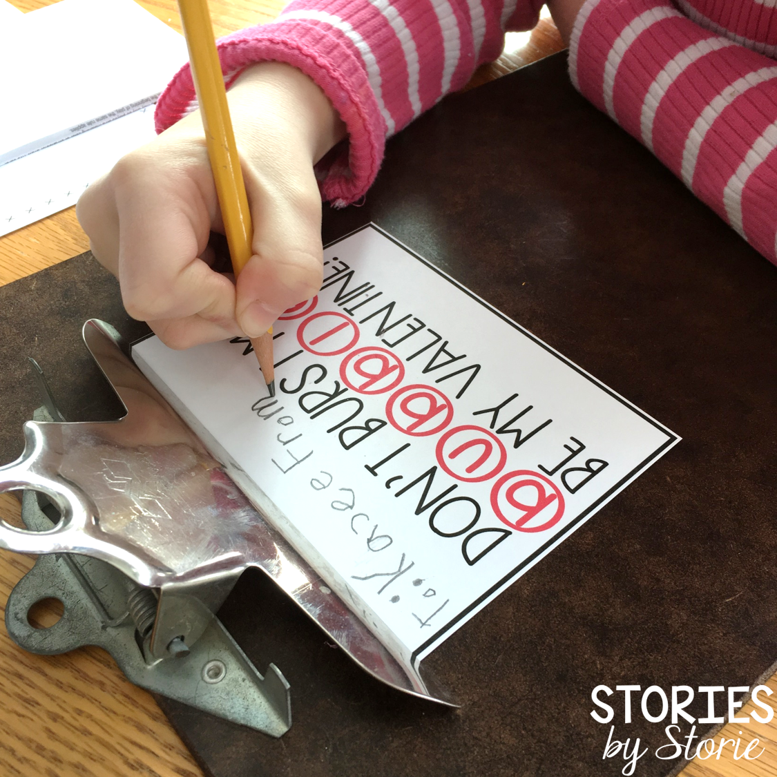After printing the valentine cards and cutting them apart, it was time to get started. She used her class list to write names on each and every valentine. This step took the longest.