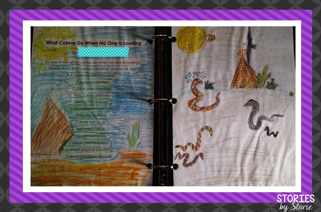 After some revisions and editing, I type the poems for my students onto a single piece of paper. Then I give them a second sheet of paper to illustrate their poem. Finally, we mount the pages and combine everything into one entertaining class book! Here are some completed poems: